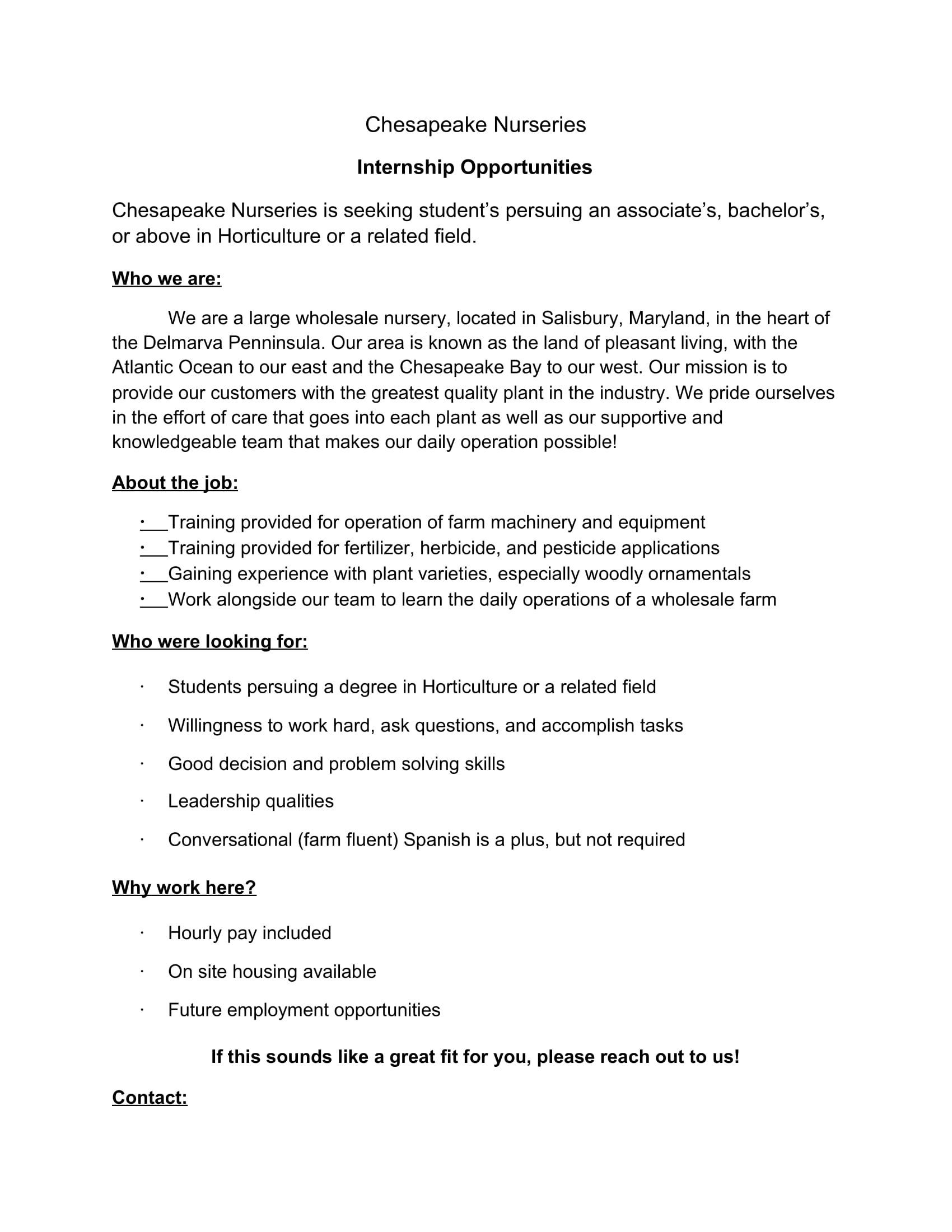 If you are interested in our college internship opportunities, please call the Main Office at (410) 742-5622, or email sydney@chesapeakenurseries.com.